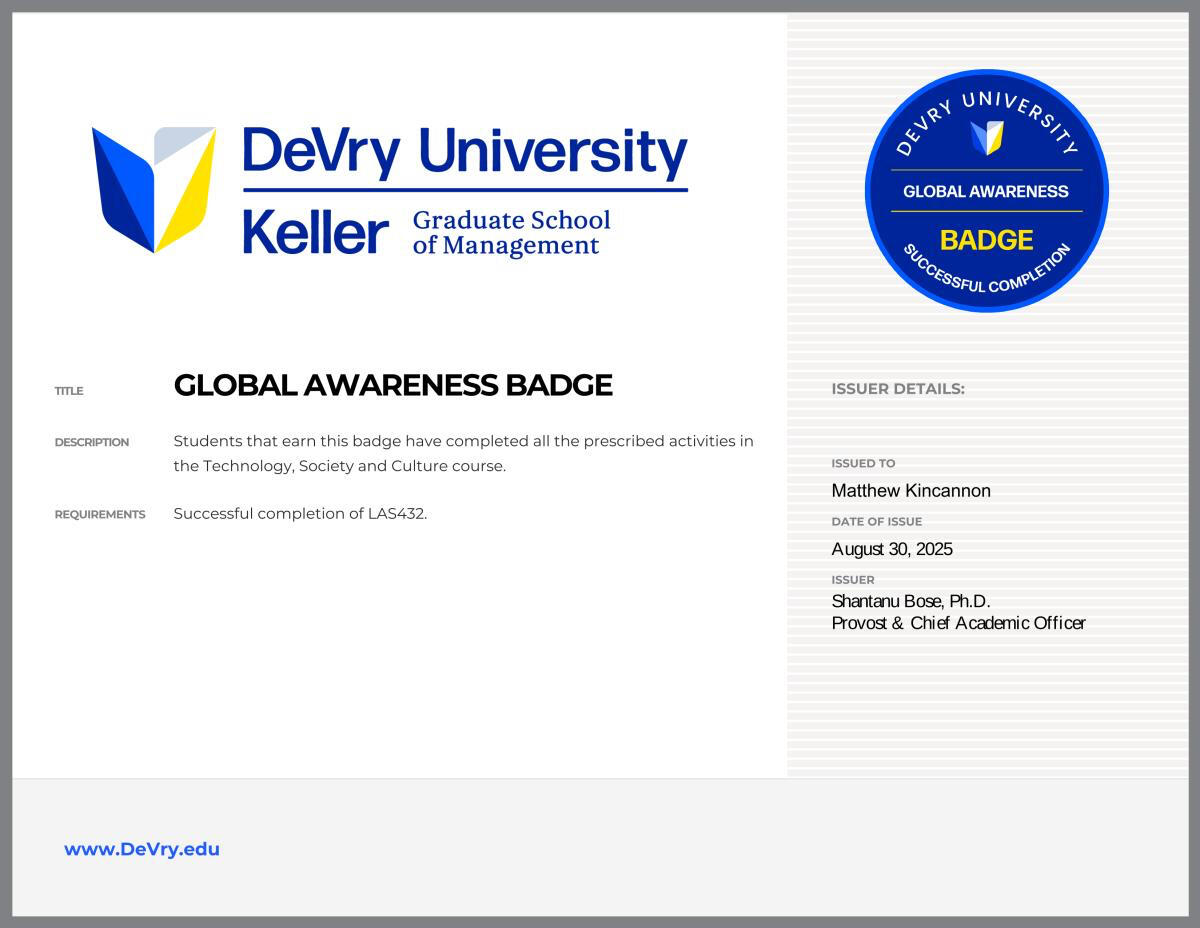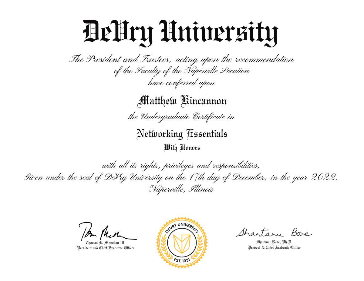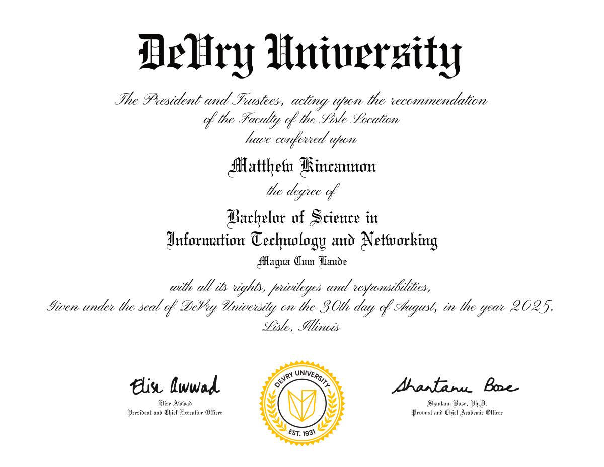 Hello! My name is Matthew Kincannon. I work as an electrical controls engineer at DENSO, one of the world's leading auto parts manufacturers. My department focuses on product traceability and analytics by integrating OT and IT systems. We facilitate communication and data storage from PLC and PC based manufacturing machinery to enterprise servers and databases. In August 2025, I completed my bachelor's degree in Information Technology and Networking with a concentration in Cloud-based Networking and Virtualization. I graduated Magna Cum Laude with a GPA of 3.8/4.0.I am using this site as a portfolio to showcase my various projects from school, home, and career. I will keep this updated as things change, so feel free to check back later. There is a link at the bottom of the page to my LinkedIn if you'd like to connect, as well as links to Credly and Microsoft to verify my certifications. Thank you for stopping by!