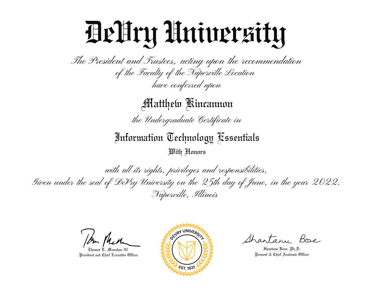 Hello! My name is Matthew Kincannon. I work as an electrical controls engineer at DENSO, one of the world's leading auto parts manufacturers. My department focuses on product traceability and analytics by integrating OT and IT systems. We facilitate communication and data storage from PLC and PC based manufacturing machinery to enterprise servers and databases. In August 2025, I completed my bachelor's degree in Information Technology and Networking with a concentration in Cloud-based Networking and Virtualization. I graduated Magna Cum Laude with a GPA of 3.8/4.0.I am using this site as a portfolio to showcase my various projects from school, home, and career. I will keep this updated as things change, so feel free to check back later. There is a link at the bottom of the page to my LinkedIn if you'd like to connect, as well as links to Credly and Microsoft to verify my certifications. Thank you for stopping by!